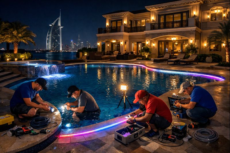 Pool lighting installation and upgrade services in Dubai enhance safety and aesthetics, especially for night swimming. We install and replace underwater LED pool lights, fiber optic lighting, and decorative pool lighting systems. LED pool lights offer energy efficiency, long lifespan, and vibrant color options that transform your pool area into a luxury outdoor space. During renovation, we ensure proper electrical safety, waterproof fittings, and compliance with Dubai regulations.